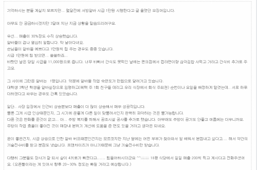 주인은 이어 "계속 장사가 잘돼서 알바들 시급을 1만5천원이나 2만원씩 펑펑 주며 돈도 많이 벌고 싶다"고 글을 맺었다.