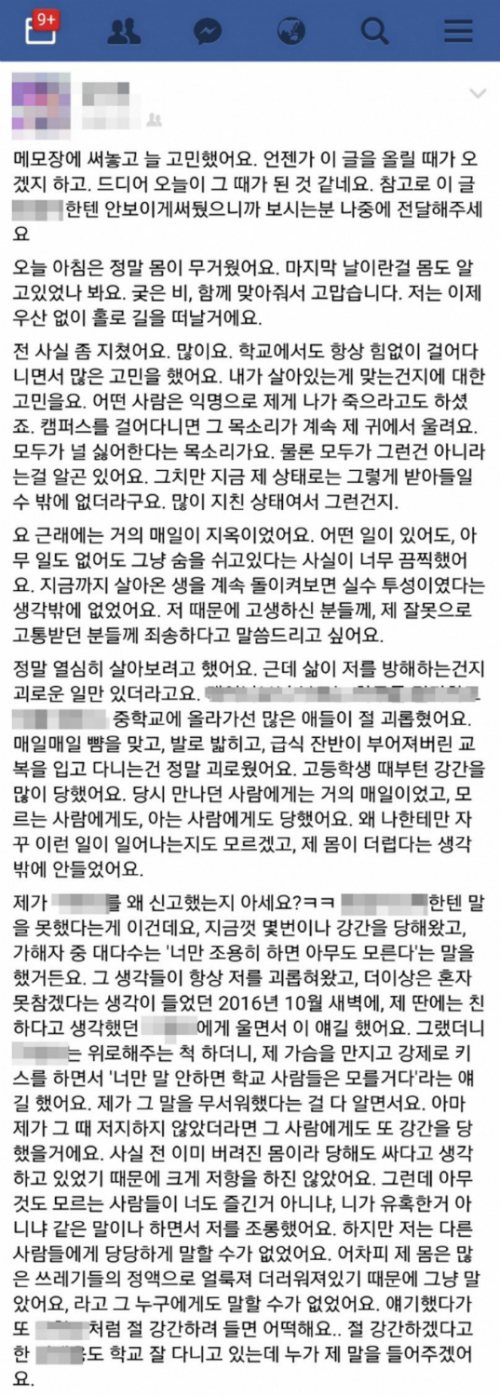 A씨가 SNS에 남긴 글에는 "중학교 때부터 괴롭힘을 당했고, 고등학교 때부터 성폭행을 많이 당했다. 지금껏 몇 번이나 성폭행을 당해왔고 가해자 중 대다수는 '너만 조용하면 아무도 모른다'라는 말을 했다. 오늘 스스로 목숨을 끊겠다"라는 내용이 담겨 있다.