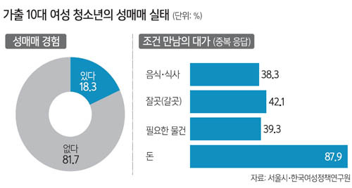상황이 이렇다 보니 가출 10대 여성의 상당수는 잠잘 곳과 먹을 것을 마련하려고 성매매 덫에 빠져들고 있다. 2015년 서울시의 조사에 따르면 가출한 10대 여성의 18.3%는 성매매 경험이 있었는데, 대부분 숙식 해결을 위한 생계형 성매매인 것으로 나타났다. 밤에 잘 곳이 없어 성매매를 하는 경우가 많다는 의미다. 성매매에 유입되지 않기 위해 필요한 것으로는(중복응답) ‘거주지 제공’(78.5%)과 ‘일자리 제공’(47.8%)이 꼽혔다.