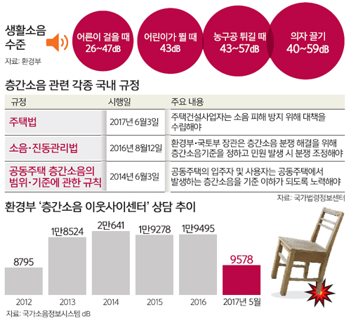 층간소음에 노출될 가능성이 높은 인구가 늘면서 갈등 사례도 급증하고 있다. 환경부의 ‘층간소음 이웃사이센터’에 접수된 상담 건수는 2012년 8795건에서 2014년 2만641건으로 치솟았다. 이후 약간 줄기는 했지만 1만9000건 이상을 기록했고 올해는 5월까지 9578건이 접수됐다.
