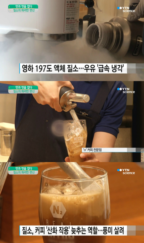 | 질소로 만든 과자, 이른바 '용가리 과자'를 먹은 아이의 위에 구멍이 나는 일이 발생했다. 아이스크림에 질소를 첨가해 '질소 아이스크림'을 만드는 장면(맨 위 사진)과 커피에 질소를 섞어 '질소 커피'를 만드는 모습(가운데 사진). YTN 캡처 |
