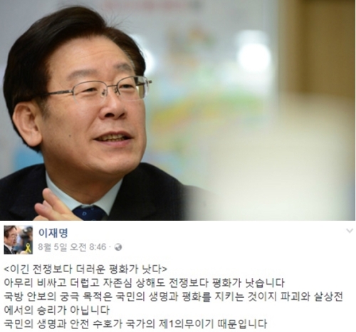 이 시장은 “아무리 비싸고 더럽고 자존심 상해도 전쟁보다 평화가 낫다"며 "국방 안보의 궁극 목적은 국민의 생명과 평화를 지키는 것이지 파괴와 전쟁에서의 승리가 아니다”라고 주장했다. 이어 “국민의 생명과 안전 수호가 국가의 제1의무이기 때문이다”라고 밝혔다.