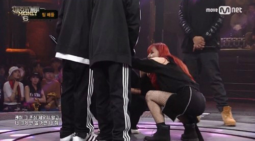 | 래퍼 넉살의 하반신을 가리키며 랩을 하는 에이솔. 출처=Mnet |
