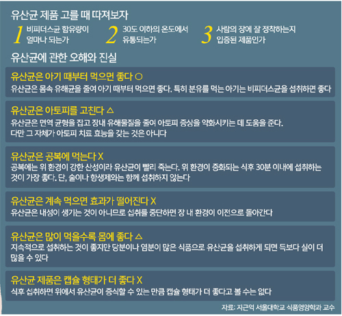 유산균을 소개할 때 ‘외부 환경에 강하다’는 문구를 많이 볼 수 있는데, 그렇다고 사람의 장에 잘 정착하는 것은 아니다. 사람의 장에서 잘 살 수 있는, 효과가 입증된 유산균 제품을 골라야 한다. 지 교수는 “일반적으로 발효유나 발효 채소에서 분리한 균보다는 인체에서 분리해 개발한 균이 사람의 장에 잘 정착하는 경향이 있다”며 “균은 주로 대장에서 활동하므로 대장에서 활동하는 비피더스 유산균은 기본적으로 섭취하는 것이 건강에 좋다”고 말한다.