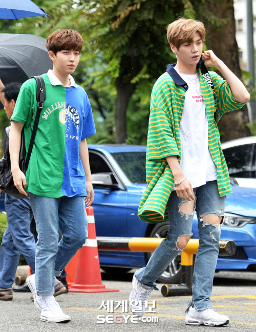 그룹 워너원 김재환(왼쪽), 강다니엘이 14일 오후 서울 여의도 KBS 신관에서 진행되는 '불후의 명곡' 녹화를 위해 촬영장에 도착해 이동하고 있다.