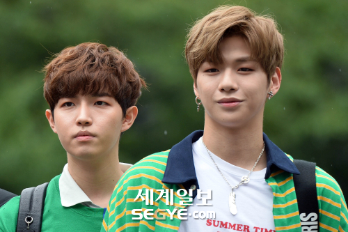 그룹 워너원 김재환(왼쪽)과 강다니엘이 14일 오후 서울 여의도 KBS 신관에서 진행되는 '불후의 명곡' 녹화를 위해 촬영장에 도착해 포즈를 취하고 있다.
