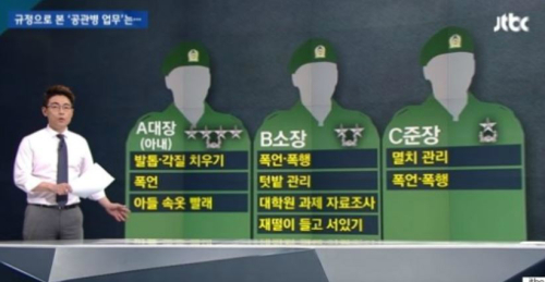 | 박찬주 대장 부인의 공관병에 대한 갑질을 계기로 곯아 있던 종기 '갑질'이 터지자 정부는 국방부 공관병 제도를 폐지하는 등 대책을 마련해 발표했다. 사진은 장성들의 공관병 갑질 사례를 열거하고 있는 방송 보도. 사진=JTBC 캡처 |