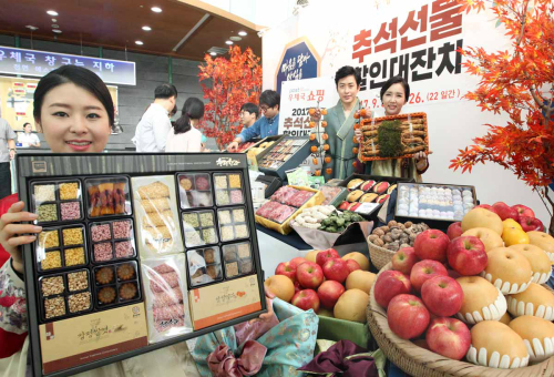 5일, 오전 서울중앙우체국 현관에서 에서 열린 ‘2017년 추석 선물 할인대잔치’ 사진행사에서 우체국직원들이 우리 농수특산물을 소개하고 있다.