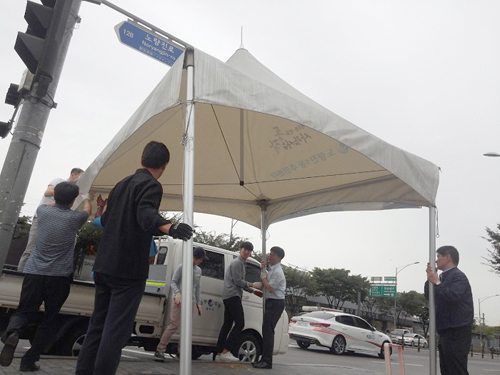 | 서울 노량진1동 주민센터 직원들이 지난 5일 동작구 노량진 삼거리와 지하철 1·9호선 노량진역 인근에 3개월간 설치되어 있던 그늘막(몽골천막)을 철거하고 있다. |