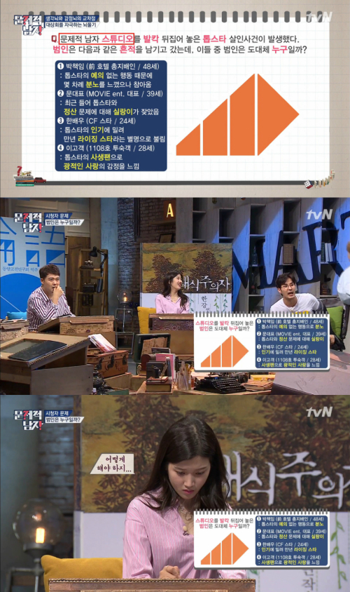 | 문가영(맨 아래)이 10일 방송된 tvN '문제적 남자'에 게스트로 출연해 고난이도 문제를 풀며 고민하고 있다. 사진=tvN 캡처 |