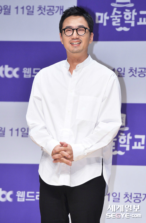 배우 유승수가 11일 오후 서울 상암동 JTBC 사옥에서 열린 JTBC 웹드라마  '마술학교' 제작발표회에 참석해  취재진을 향해 미소를 지으며 포즈를 취하고 있다.