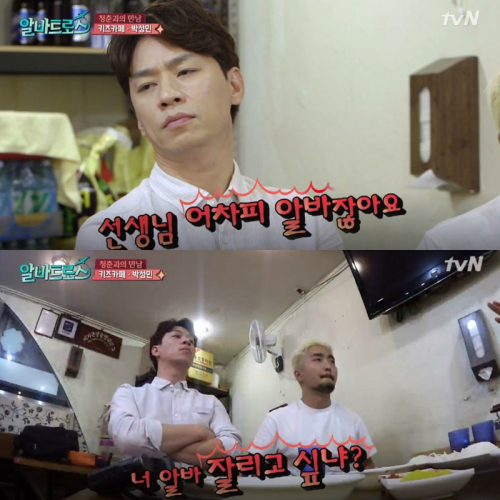 지난 13일 방송된 tvN '알바트로스'에서 방송인 유병재(사진 오른쪽)와 배우 정상훈(사진 왼쪽)은 일일 키즈카페 알바생으로 변신했다.