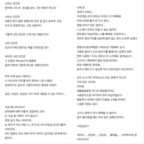 24일 김규리는 자신의 인스타그램에 과거 자신이 작성한 글을 올리고 "2008년5월1일에 썼던 글 전문입니다"라며 "국민의 건강권은 보수적으로 지켰으면 했고 검역주권 포기한것이 (미국과) 내내 마음에 걸려서 썼던 글입니다"라고 설명했다.