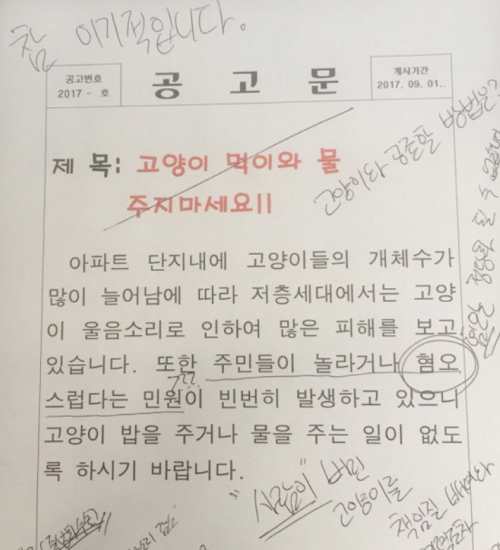 최근 한 온라인 커뮤니티에는 '고양이 먹이와 물을 주지 말라'는 한 아파트 공고문이 올라와 눈길을 끌었다.