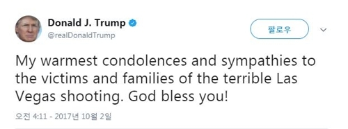 트럼프 대통령은 사건 발생 몇 시간 후 자신의 트위터 계정을 통해 "끔찍한 라스베이거스 총격 사건의 희생자와 가족들에게 심심한 애도와 연민을 전한다. 신의 가호가 있기를!"이라고 말했다.