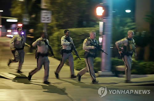 | (라스베이거스<미 네바다주> AP=연합뉴스) 미국 네바다 주 라스베이거스 유명 관광지인 만달레이 베이 호텔 카지노 거리에서 1일 밤(현지시간) 괴한이 무차별 총격을 가해 수백명의 사상자가 발생했다. 사진은 무장 경찰이 사건 현장 주변으로 출동하는 모습. bulls@yna.co.kr |