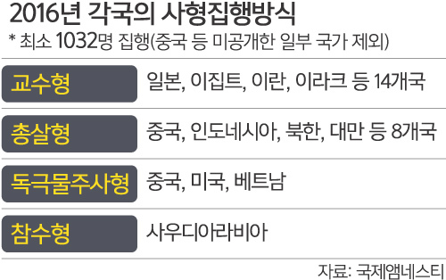 국제앰네스티에 따르면 지난해 세계에서 집행된 사형은 교수형(14개국), 총살형(8개국), 약물주사형(3개국), 참수형(1개국)으로 이뤄졌다.