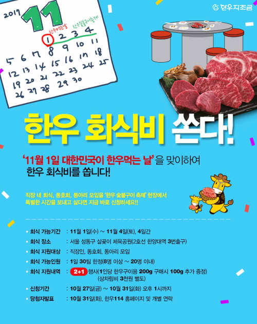 이밖에도 회식 이벤트 당첨자 중 한우자조금 SNS(페이스북,블로그,인스타)에 후기 등록시에는 추첨을 통해 한우 선물세트(3명)도 증정할 예정이다.