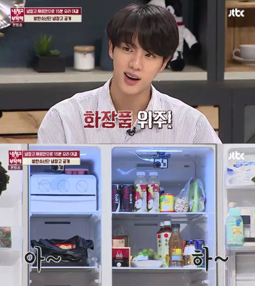 | 방탄소년단 멤버 진(위 사진)이 JTBC 예능 프로그램 '냉장고를 부탁해'에 출연해 숙소 냉장고를 공개하고 있다. 사진=JTBC 캡처 |