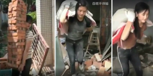 지난 6월부터 중국 온라인 커뮤니티에 올라와 페이스북으로 공유되기 시작한 이 영상에는 마른 몸의 여성이 무거운 시멘트와 벽돌 등을 나르는 모습이 담겼다.