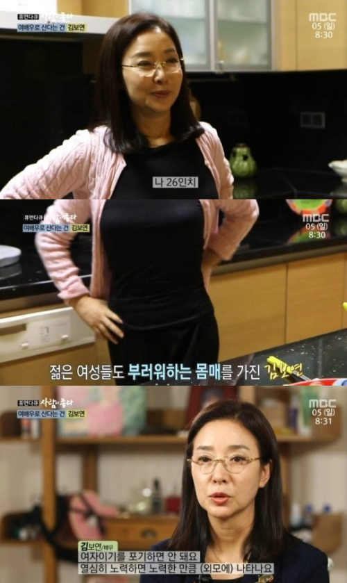 김보연은 5일 오전 방송된 MBC '휴먼다큐 사람이 좋다'에 출연해 "내 허리는 26인치"라며 날씬한 몸매를 자랑했다.
