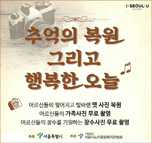 서울시와 서울시노인종합복지관협회는 오는 12월 말일까지 ‘추억의 복원, 행복한 오늘’이라는 주제로 어르신들의 추억사진 복원 및 무료 사진 촬영 사업을 실시한다고 6일 밝혔다.