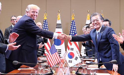 | 문재인 대통령과 도널드 트럼프 미국 대통령이 7일 오후 청와대에서 열린 확대정상회담에서 악수하고 있다. 사진=연합뉴스 |