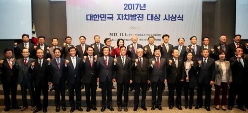 | ‘2017년 대한민국 자치발전 대상’ 수상자들이 김안제 한국자치발전연구원장(앞줄 오른쪽서 7번째)과 함께 기념사진을 찍고 있다. |