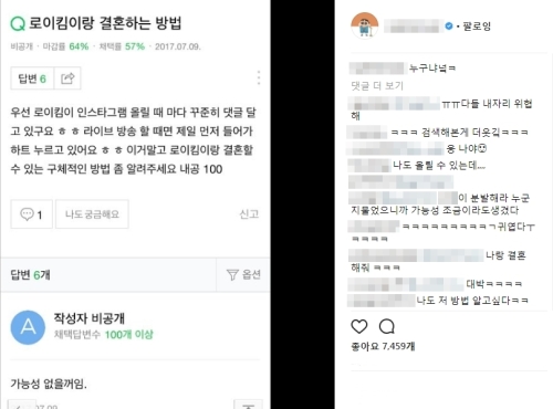 사진에는 포털사이트에 익명의 글쓴이가 '로이킴이랑 결혼하는 방법'이라는 제목으로 올린 질문글이 담겨있다.