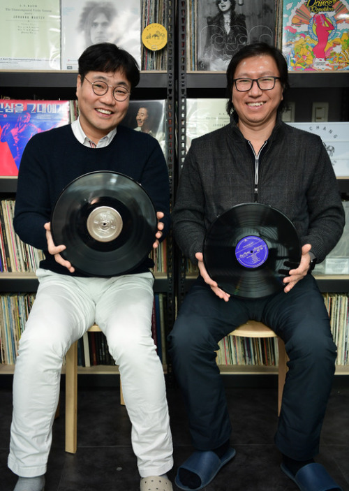 | 국내 유일 LP 제작사 마장뮤직앤픽처스의 하종욱 대표이사와 백희성 실장(오른쪽)은 “우리가 귀로 듣는 모든 소리는 자연의 소리이고, 아날로그”라며 “LP는 이 자연스러운 소리를 그대로 물리적으로 담아 재생한다”고 입을 모았다. 이재문 기자 |