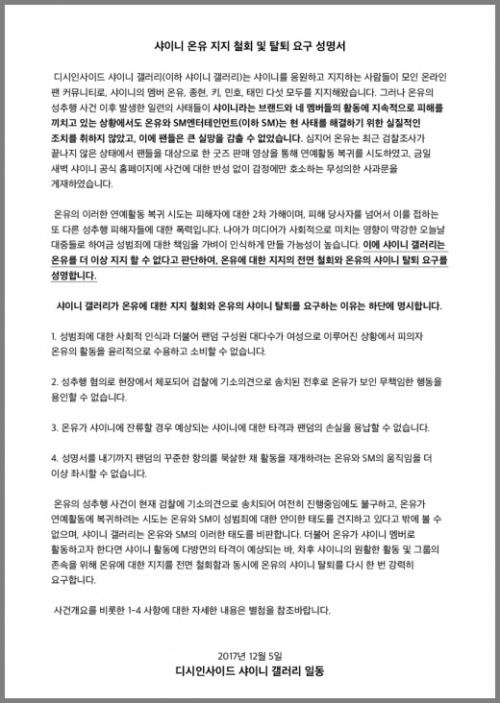 샤이니 갤러리 측은 '온유 지지 철회 및 샤이니 탈퇴 요구 성명서'를 올렸다. 이들은 "온유의 활동을 윤리적으로 수용하고 소비할 수 없다"며 "차후 샤이니의 원활한 활동 및 그룹의 존속을 위해 온유에 대한 지지를 전면 철회함과 동시에 온유의 탈퇴를 다시 한 번 강력히 요구한다"고 밝혔다.