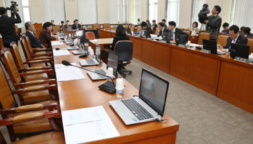 | 정개특위 한국당 불참 ‘파행’ 7일 국회에서 열린 정치개혁특별위원회 전체회의에 자유한국당 의원들이 불참해 회의장 한쪽이 텅 비어 있다. 이날 전체회의는 한국당 불참으로 30여분 만에 산회됐다. 연합뉴스 |