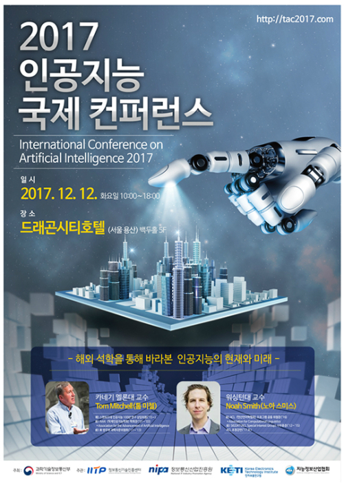 '2017 인공지능 국제 컨퍼런스'는 인공지능 분야의 세계적 권위자들을 초청해 미래 인공지능 산업 전망 및 선진연구 동향을 살펴보고, 국내 인공지능 산업의 활성화를 모색하기 위한 행사로 카네기 멜론 대학(CMU) Tom Michell 교수, 워싱턴 대학 Noah Smith 교수, 일본 국립 산업 기술 연구소(AIST)의 인공지능연구소(AIRC) 센터장 주니치 츠지가 참석한다.