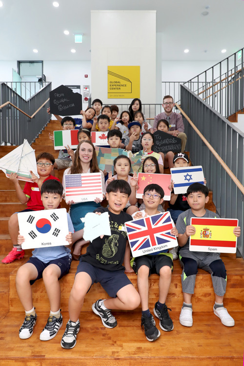 | 서울 성동구 금호글로벌체험센터에서 외국어를 배우는 학생들이 원어민 교사와 함께 각 나라의 국기를 들어보이고 있다. 성동구 제공 |