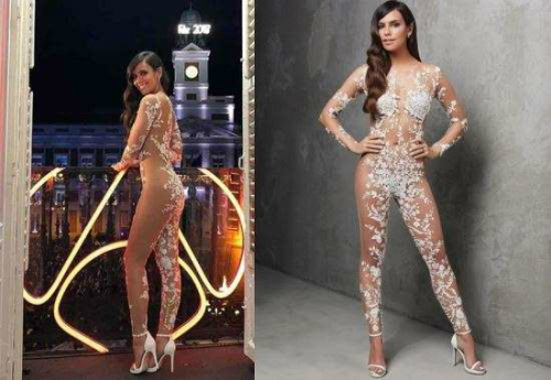 스페인 여성 방송인(사진)이 연말연시 방송에 누드 드레스를 입고 나와 화제가 됐다.