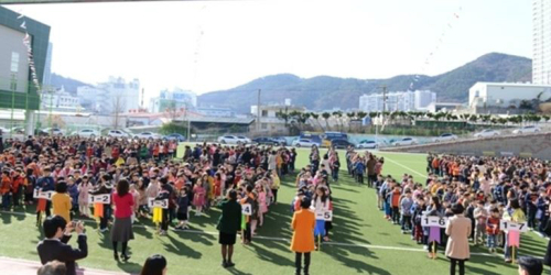 | 부산의 한 초등학교 입학식 광경. 1학년 7반까지 있는 모습이 이채롭다. 서울의 경우 2018년 초등학교 신입생이 16명에 불과한 학교가 있는 등 전체 초교 중 6.5%인 37개교가 2개학급 미만만 편성하게 됐다. |