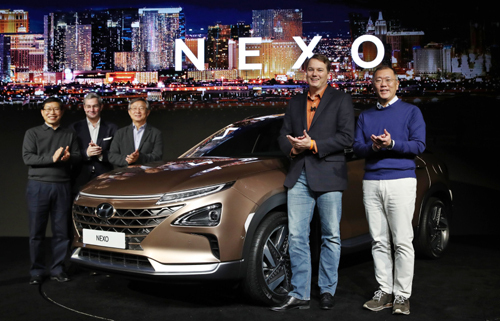 | ‘CES 2018’ 개막을 하루 앞둔 8일(현지시간) 미국 라스베이거스 만달레이베이 호텔 컨벤션센터에서 열린 현대자동차 프레스 콘퍼런스에서 정의선 부회장(오른쪽에서 첫 번째)과 미국 자율주행 전문기업 오로라의 크리스 엄슨 사장(〃 두 번째)이 이번에 새로 공개한 수소연료전지 전기차 ‘넥쏘(NEXO)’ 앞에서 박수를 치고 있다. 라스베이거스=연합뉴스 |