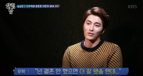 또 민우혁은 "주변에서 이렇게 이야기한다. '넌 결혼 안 했으면 더 잘 됐을텐데'라고. 하지만 난 '아니다'라고 한다"고 아내에 대한 애정을 과시했다.