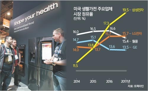 28일 미국의 시장조사업체인 트랙라인에 따르면, 삼성전자는 지난해 4분기 현지 생활가전시장에서 전년 동기 대비 2.3%포인트 상승한 21.0%의 점유율(금액 기준)을 기록했다. 분기 점유율이 20%를 넘어선 것은 이번이 처음이다. 연간 기준으로는 전년보다 2.2%포인트 오른 19.5%의 점유율을 달성했다.