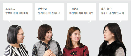 윤= “맞다. 아이의 학업 성과가 내 성적표가 아닌데 못 따라가면 나의 ‘근무태만’으로 여기는 주변 분위기가 있다. 학교에서도 미리 배워오는 걸 가정하고 가르치니 사교육을 안 할 수 없고 전업주부인 내가 안 나설 수가 없다. 보육과 교육의 질이 부모의 기대에 못 미치는 부분을 여성의 희생으로 메우고 있다.”