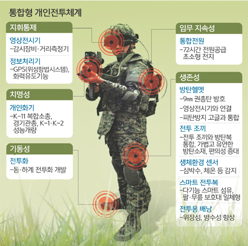 육군 관계자는 “2014년 우크라이나와 러시아 분쟁 때 우크라이나군과 친러시아 반군조차 상당한 수준의 미래형 개인 전투체계를 갖추고 전투에 임했다”며 “우리 군은 아직도 20세기 병사의 패러다임을 벗어나지 못한 상태”라고 말했다.