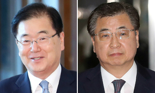 | 투톱 청와대가 4일 미국통인 정의용 청와대 국가안보실장(왼쪽 사진)을 수석으로 하는 대북 특별사절단 명단을 발표했다. 2007년 이후 11년 만에 북한에 파견되는 특사단에는 정 실장을 비롯해 북한통인 서훈 국가정보원장(오른쪽), 천해성 통일부 차관, 김상균 국정원 2차장, 윤건영 청와대 국정상황실장이 포함됐다. 연합뉴스 |