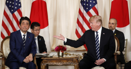 | 도널드 트럼프 미국 대통령(오른쪽)과 아베 신조 일본 총리가 17일(현지시간) 플로리다주 팜비치 마라라고 리조트에서 만나 회담에 앞서 발언하고 있다. 사진=AP/뉴시스 |