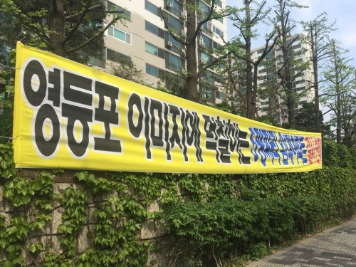 서울 2·5호선 영등포구청역 2번 출구에서 도보 5분 거리에 있는 하이마트 부지로 가는 길엔 ‘영등포 이미지에 먹칠하는 5평짜리 임대아파트 결사반대’라고 적힌 현수막이 걸려 있었다.