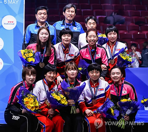| 스웨덴 할름스타드에서 열린 2018 세계탁구선수권대회(단체전)에서 여자 남북단일팀 선수 9명(한국 5명, 북한 4명)이 5일(현지시간) 동메달을 목에 걸고 포즈를 취하고 있다. |