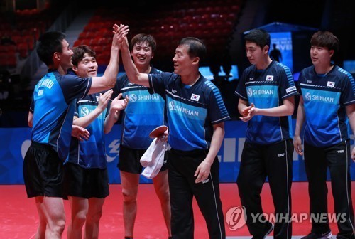 | 4일(현지시간) 스웨덴 할름스타드 아레나에서 열린 2018 세계탁구선수권대회 남자단체전 8강, 일본과의 경기를 승리한 한국 대표팀 선수들이 파이팅하고 있다. 대한탁구협회 제공 |