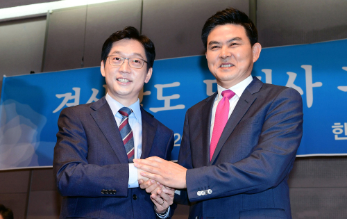 | 악수는 하지만… 6·13 경남도지사 선거에서 맞붙게 된 더불어민주당 김경수 후보(왼쪽)와 자유한국당 김태호 후보가 8일 오전 서울 중구 프레스센터에서 열린 ‘경남지사 후보 초청 관훈클럽 토론회’ 참석에 앞서 손을 맞잡고 기념촬영하고 있다. 이재문 기자 |