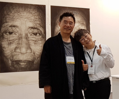 | 광주에 갤러리를 오픈한 골프선수 신지애씨(오른쪽)와 신씨의 아버지 신재섭씨. 신제섭씨 제공 |