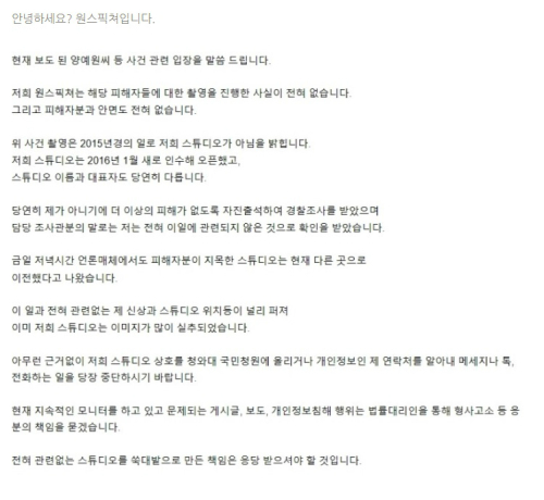 원스픽쳐 운영자는 지난 17일 공식 카페에 "현재 보도 된 양예원씨 등 사건 관련 입장을 말씀 드린다"며 "저희는 해당 피해자들과 촬영을 진행한 사실이 전혀 없고 안면도 전혀 없다"는 글을 게재했다.