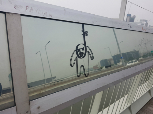 | 서울 마포대교에 새겨진 자살을 연상시키는 그림 낙서. |